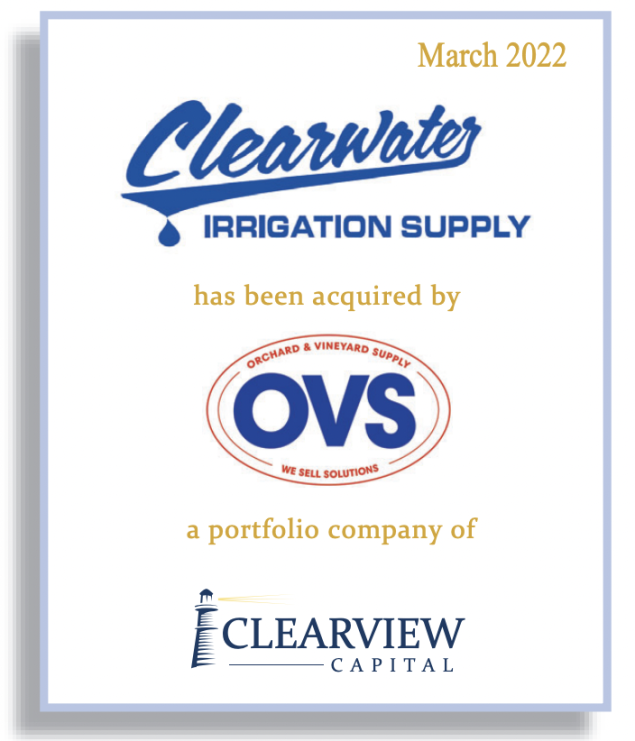 Stamford, CT, March 16, 2022 — Clearview Capital Fund III, L.P. (“Fund III”) announced today the acquisition of Clearwater Irrigation Supply (“Clearwater”) by its portfolio company, Orchard & Vineyard Supply (“OVS”). The transaction closed on March 1, 2022.