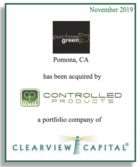 Stamford, CT, December 10, 2019— Clearview Capital Fund III, L.P. (“Fund III”) announced today that its portfolio company, Controlled Products, LLC (“Controlled Products”) and its affiliates, have acquired a majority stake in Purchase Green, LLC and Path to Prosperity, LLC (collectively “Purchase Green” or the “Company”). The transaction, which closed on November 20, 2019, included a significant reinvestment by the management team who will remain in their current roles to run the Company.